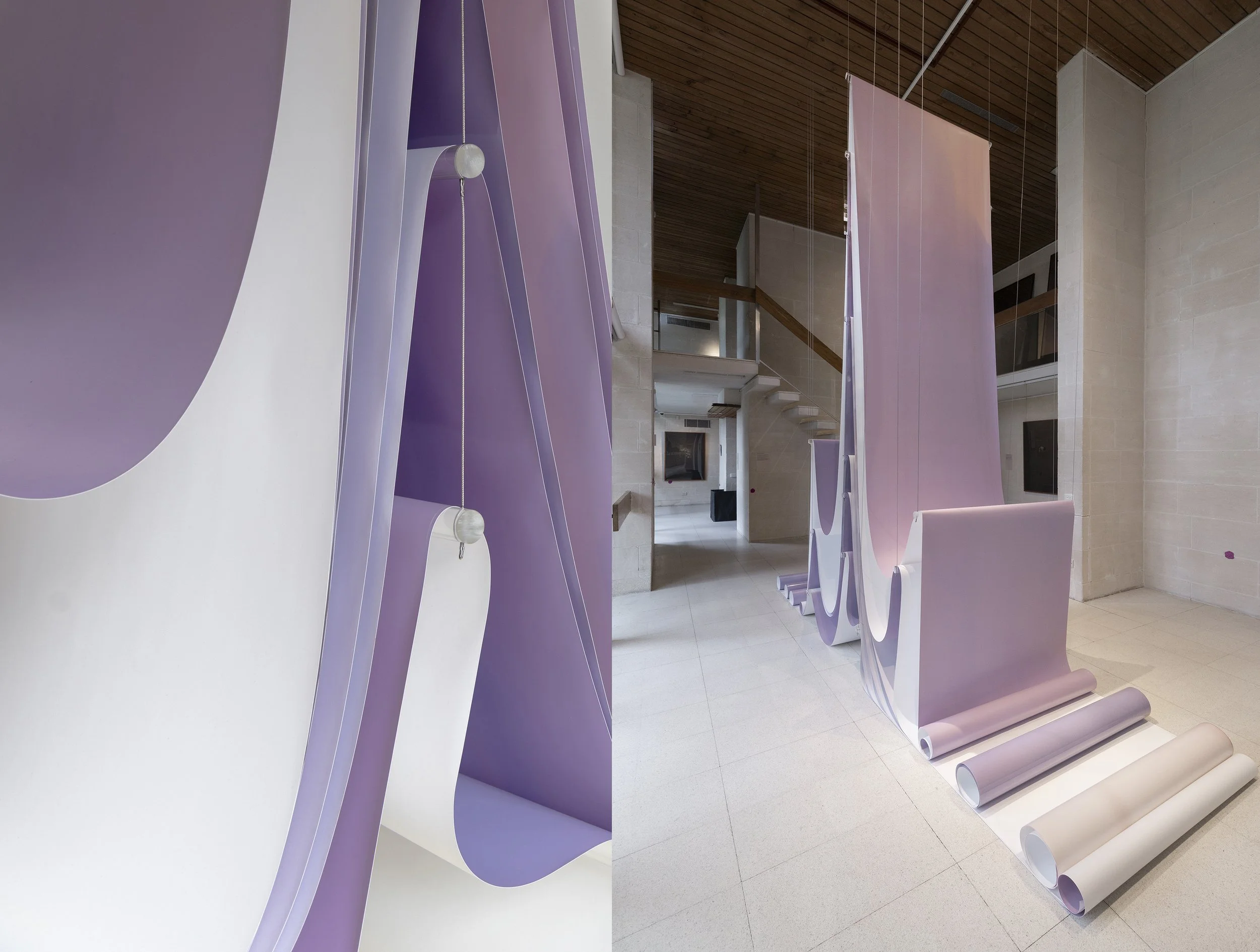 Developed while diving in response to a sunken rock formation on the cusp of the Pacific Ocean and East China Sea, this 30-meter installation uses drapery as a visual strategy to metaphorically suspend reality, evoke precarity, instability and change. Made during fieldwork diving the ruins of the underwater rock formation, the project experimented with a series of pictorial textiles, suspended to make the form appear like it is on the wall, but also falling off its surface. Elements included fragmented images on aluminium, that provided a play of light and experienced differently at distance and close proximity.